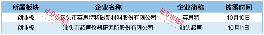 据统计, 10月7日至10月13日,证监会披露了2家拿到注册批文企业的情况 ,分别为包头市英思特稀磁新材料股份有限公司(以下简称“英思特”)和汕头市超声仪器研究所股份有限公司(以下简称“汕头超声”)。